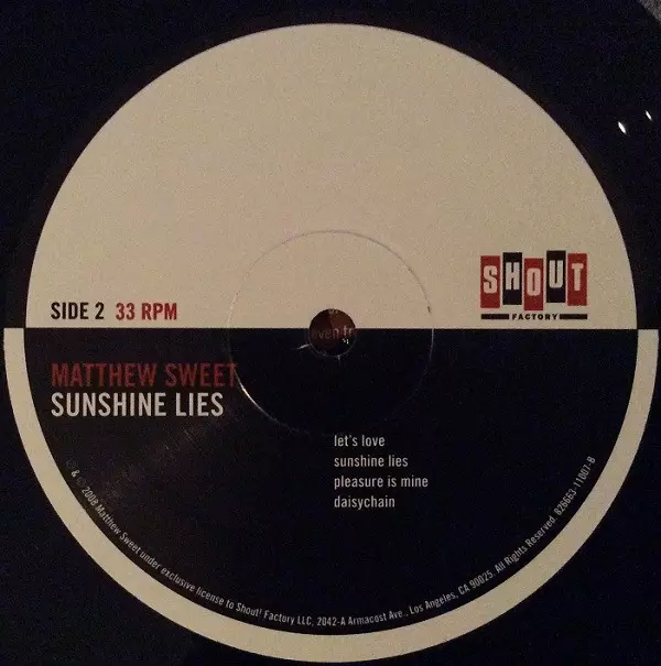 Matthew Sweet: Sunshine Lies Die Version auf Vinyl 2LP in Standard- Auflage. Diese besondere Auflage wurde veröffentlicht in USA im Verlag Shout! Factory am 26. August 2008. Album Genres übergreifend Rock, Alternative rock, Indie-Rock und Rock & Roll.