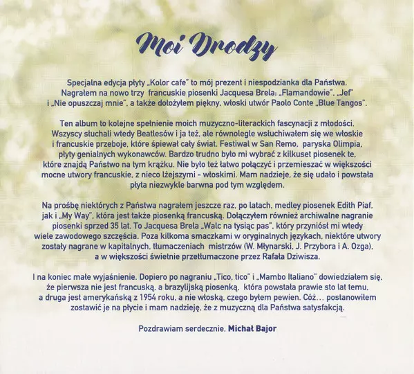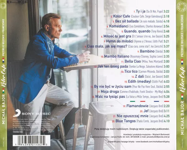 Michał Bajor: Kolor Cafe. Przeboje Włoskie I Francuskie Die Version auf CD in Standard- Auflage. Diese besondere Auflage wurde veröffentlicht in Polen im Verlag Sony Music am 19. März 2021. Album kann als folgendes Genre klassifiziert werden Pop.