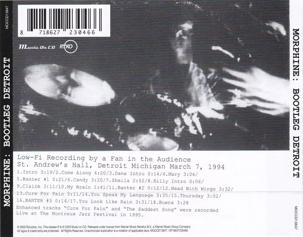 For those who have never had the opportunity to see Morphine's fantastic live show, this recording is as good as it gets. They are unpretentious and raw. Here, singer Mark Sandman on two-string bass (slide bass), Dana Colley on (double) baritone/tenor sax and Billy Conway on drums and backing vocals go full throttle. The recording was made LIVE ...