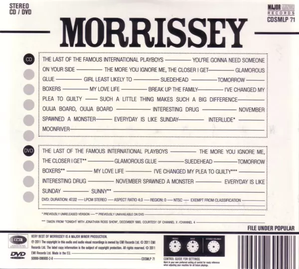 Morrissey: Very Best Of Die Version auf CD/DVD in remastered Auflage. Diese besondere Auflage wurde veröffentlicht in UK im Verlag Major Minor am 3. Mai 2011. Album Genres übergreifend Rock, Alternative rock und Brit Pop. Digi Sleeve.