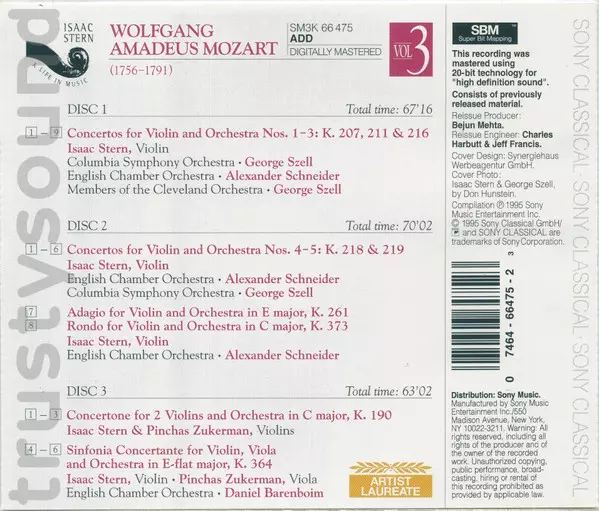 | Künstler | Wolfgang Amadeus Mozart | George Szell | Isaac Stern | Pinchas Zukerman | Alexander Schneider | Walter Trampler | Leonard Rose |