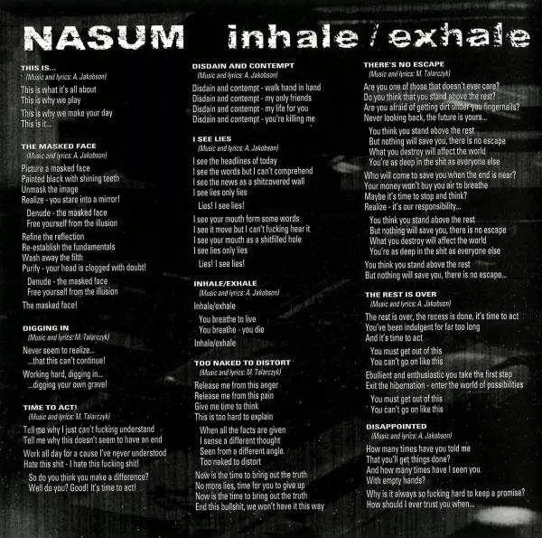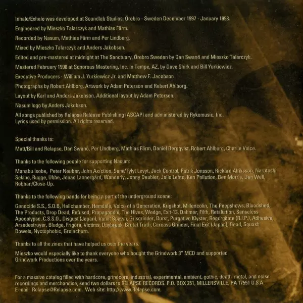 Nasum: Inhale / Exhale Die Version auf CD in Standard- Auflage. Diese besondere Auflage wurde veröffentlicht in USA im Verlag Relapse Records am 24. März 2011. Album Genres übergreifend Rock und Grindcore.