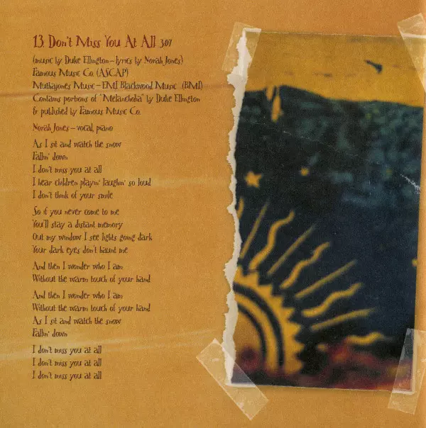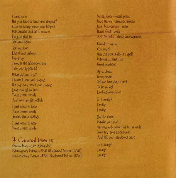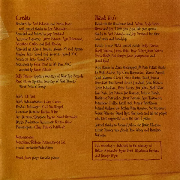 Acoustic Guitar Jesse Harris, Kevin Breit | Bass Lee Alexander | Musical Box [Box] Andrew Borger | Pump Organ Rob Burger | Vocals, Piano Norah Jones | Written-By Lee Alexander, Richard Julian