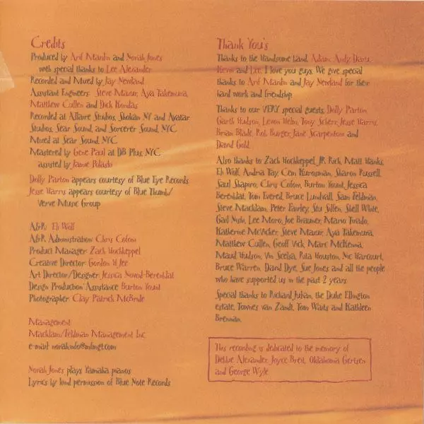 Acoustic Guitar Jesse Harris, Kevin Breit | Bass Lee Alexander | Groovebox [Box] Andrew Borger | Organ [Pump Organ] Rob Burger | Vocals, Piano Norah Jones | Written-By Lee Alexander, Richard Julian