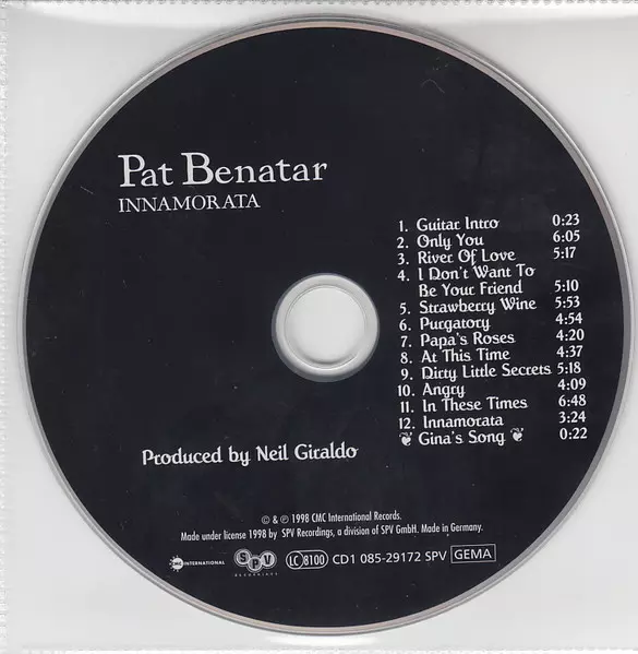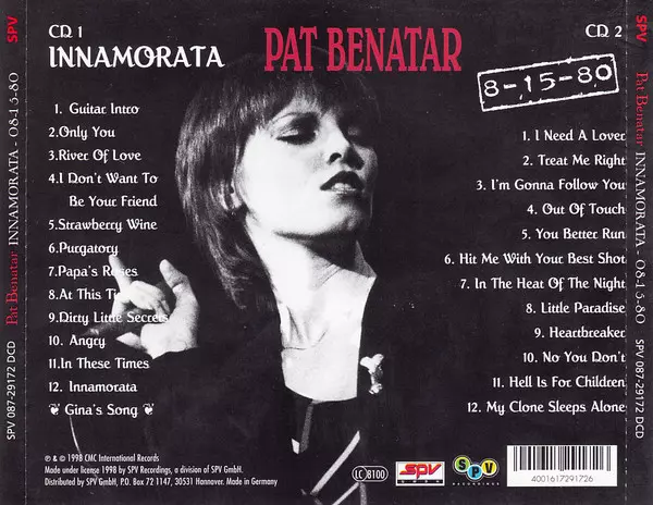 Pat Benatar: Innamorata / 8-15-80 Die Version auf 2CD in Standard- Auflage. Diese besondere Auflage wurde veröffentlicht in Deutschland im Verlag SPV Recordings In Zusammenarbeit mit CMC International Records Im Jahr 1998. Album Genres übergreifend Rock, Akustische Musik und Pop Rock.