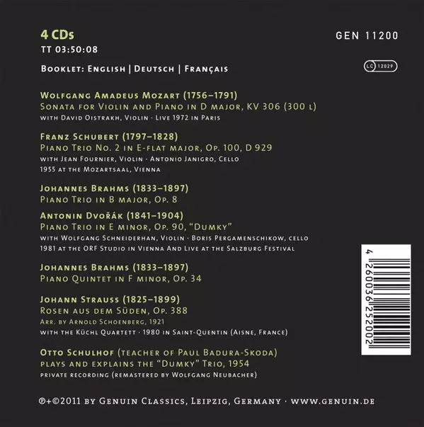 | Künstler | David Oistrach | Paul Badura-Skoda | Wolfgang Schneiderhan | Boris Pergamenschikow | Antonio Janigro | Jean Fournier | Otto Schulhof | Küchl-Quartett |