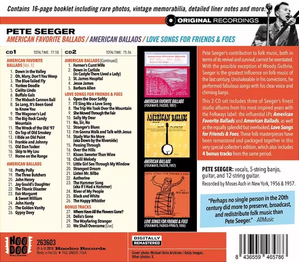 Pete Seeger: American Favorite Ballads Plus American Ballads And Love Songs For Friends & Foes Die Version auf 2CD in remastered Auflage. Diese besondere Auflage wurde veröffentlicht in Europa im Verlag Hoodoo Records am 21. September 2018. Album kann als folgendes Genre klassifiziert werden Folk, World, & Country.