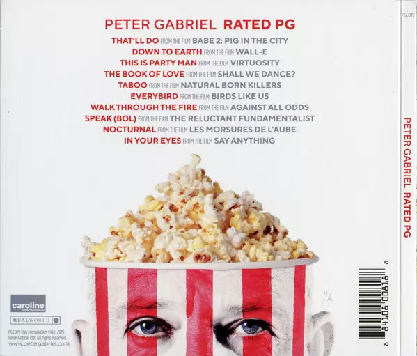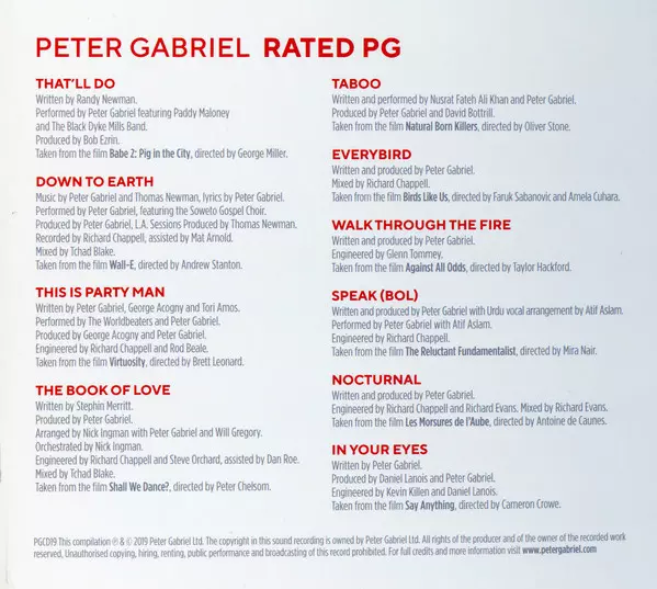Soundtrack Time Travel Peter Gabriel presents a 2019 compilation of songs from his film soundtracks called "Rated PG". The track list includes songs from over 30 years, from films like "Walk Through the Fire" (1984) to "Everybird" (2017). The album was released in 2019 as part of Record Store Day. Now, "Rated PG" is available again on CD and LP....