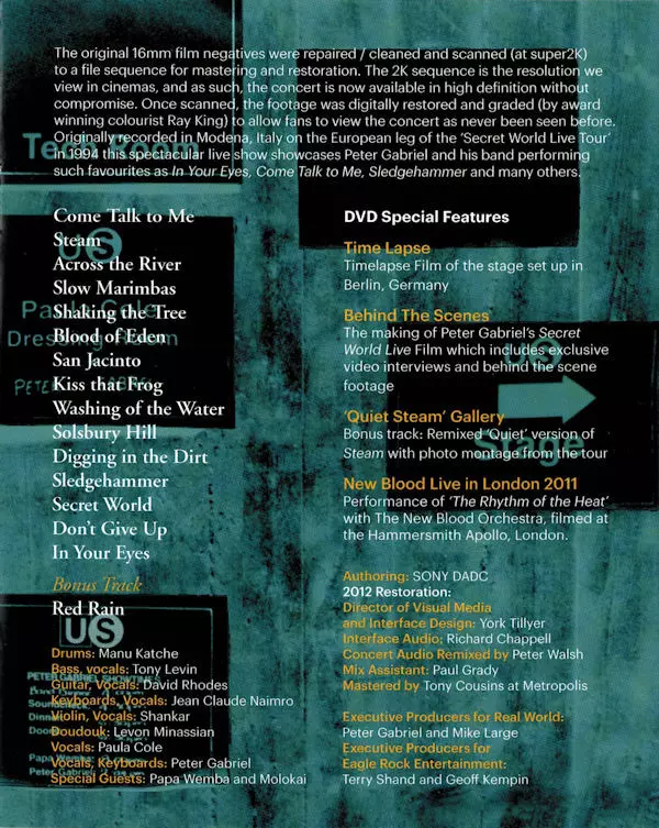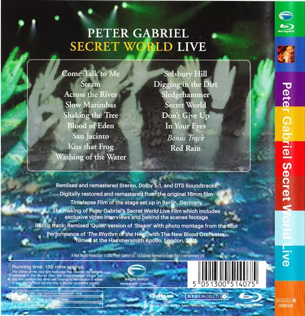 Peter Gabriel's Grammy Award-winning film "Secret World Live" has been completely restored and remastered based on the original artwork and using the latest technology currently available for sound and picture. Secret World Live" was recorded over two nights in November 1993 in Modena, Italy, as part of the highly acclaimed tour for Gabriel's "U...