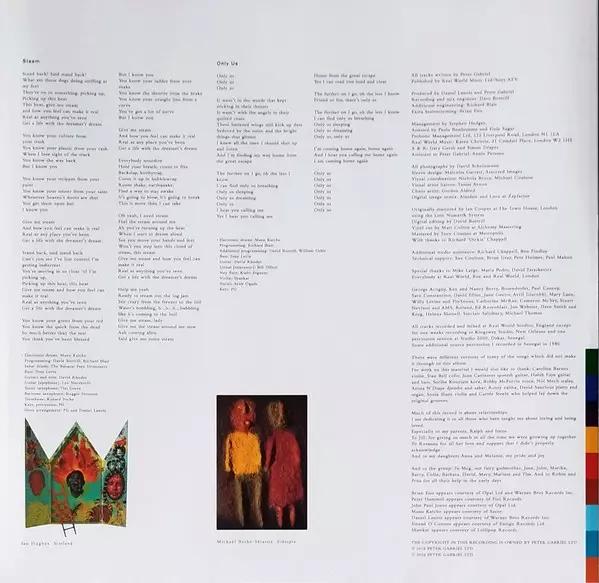 Bass Tony Levin | Djembe Babacar Faye | Drums Manu Katché | Guitar [Epiphone] Leo Nocentelli | Guitar [Guitars] David Rhodes | Keyboards [Keys], Programmed By [Programming], Bass [Keyboard Bass] Peter Gabriel | Programmed By [Programming] David Bottrill, Richard Blair | Surdo [Surdu] Hossam Ramzy | Talking Drum [Tama] Assane Thiam | Vocals Ayub Ogada, Peter Hammill, Richard Macphail