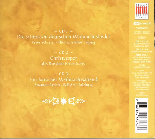 Peter Schreier: Stille Nach, Heilige Nacht (Festliche Musik Zur Weihnacht) Die Version auf 3CD/Box Set in Standard- Auflage. Diese besondere Auflage wurde veröffentlicht in Deutschland im Verlag Berlin Classics In Zusammenarbeit mit Edel Classics am 22. August 2006. Album Genres übergreifend Klassische Musik, Folk, World, & Country, Folk, Religious und Volksmusik.