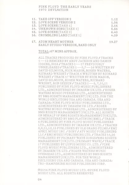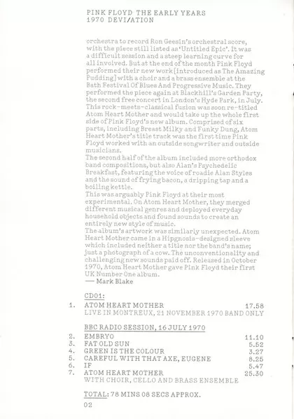 Pink Floyd: The Early Years 1970 Devi/ation Die Version auf 2CD/2DVD/Blu-ray in Standard- Auflage. Diese besondere Auflage wurde veröffentlicht in USA im Verlag Pink Floyd Records am 26. März 2017. Album kann als folgendes Genre klassifiziert werden Rock. Region 0.
