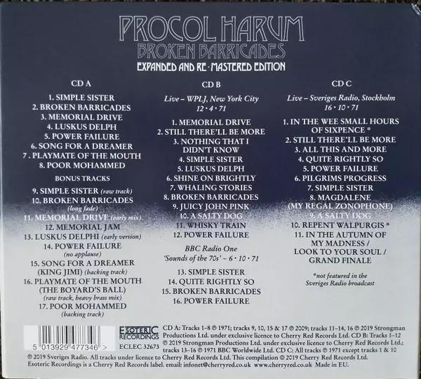 Procol Harum: Broken Barricades DLX Die Version auf 3CD in deluxe remastered Auflage. Diese besondere Auflage wurde veröffentlicht in Europa im Verlag Esoteric Recordings am 28. Juni 2019. Album Genres übergreifend Rock und Progressive rock.