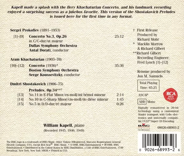 | Künstler | Dmitri Shostakovich | Sergei Prokofiev | Aram Khatchaturian | William Kapell |