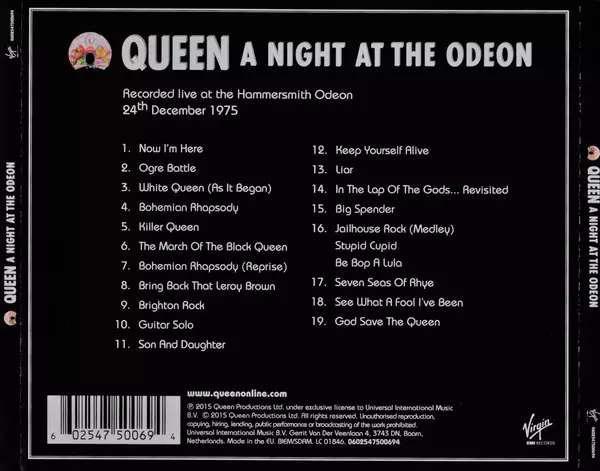 Queen: A Night At The Odeon Die Version auf CD in Standard- Auflage. Diese besondere Auflage wurde veröffentlicht in Europa im Verlag Virgin EMI Records am 27. November 2015.