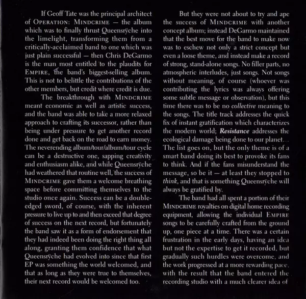 Empire wurde ursprünglich am 20. August 1990 veröffentlicht und ist das bis heute kommerziell erfolgreichste Album der Band, das Dreifach-Platin-Status erreichte. Es enthielt den Top-10-Hit »Silent Lucidity«, der für 2 Grammys nominiert war, und »Jet City Woman«. Der Nachfolger des bahnbrechenden Operation: Mindcrime, wurde von Peter Collins pro...