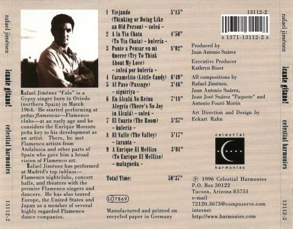 Rafael Jiménez Falo: ¡Cante Gitano! Die Version auf CD in Standard- Auflage. Diese besondere Auflage wurde veröffentlicht in USA im Verlag Celestial Harmonies am 20. Juli 1998. Album Genres übergreifend Folk, World, & Country und Flamenco.