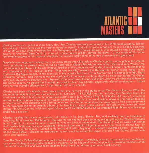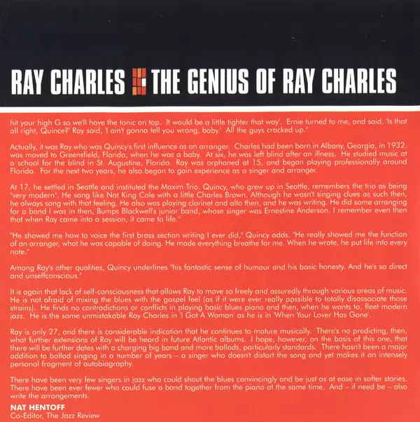 The Genius of Ray Charles is a 1959 album by Ray Charles. The album was his first release on the Atlantic label and features Charles' interpretations of other artists' songs and four original Charles compositions. The album was commercially and critically successful and helped establish Charles as one of the leading figures in soul music.