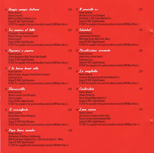 Renato Carosone: Whisky & Soda & Rock 'N' Roll Die Version auf CD in remastered Auflage. Diese besondere Auflage wurde veröffentlicht in Italien im Verlag EMI am 14. September 2010. Album Genres übergreifend Rock, Pop, Jazz, Lateinamerikanische Musik, Musik zur Entspannung, Rock & Roll, Swing und Mambo.