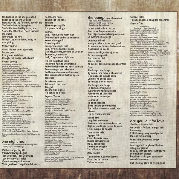 Arranged By, Conductor, Horns, Strings Hector Garrido | Backing Vocals Chris Willis | Bass Hugh McDonald | Cello Ernie Ehrhardt, Maurice Grants, Steve Richards | Cello, Contractor Suzie Katayama | Concertmaster Endre Granat | Coordinator Brian Coleman (2), Dean Lawrence, Jolie Levine | Drums Kenny Aronoff | Engineer Chris Carroll, Conrad Golding, Craig Lozowick, German Ortiz, Jimmy Hoyson, John Hendrickson, Jorge Gonzalez, Juan Turek, Matt Gruber, Nathan Malki, Oswald Bowe | Flute Nestor Torres | Guitar Eric Bazilian | Keyboards, Programmed By, Arranged By Randy Cantor | Lead Vocals Ricky Martin | Mixed By David Thoener | Other Steve Juliani | Percussion Daniel Lopez, Rafael Solano | Piano Hector Garrido, Paquito Hechavarria | Recorded By Jules Gondar, Rob Eaton | Saxophone Ed Calle | Trombone Dana Teboe | Trumpet Jim Hacker, Tony Concepcion | Trumpet, Flugelhorn Arturo Sandoval | Viola Darrin McCann, Karie Prescott, Linda Lipsett, Nancy Roth | Violin Bob Peterson, Charlie Bisharat, Edmund Stein, Eve Butler, Gary Kuo, Gerardo Hilera, Mario DeLeon, Michele Richards, Murray Adler, Rachel Purkin, Vladimir Polimatidi | Written-By Desmond Child, Robi Draco Rosa