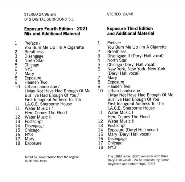 Robert Fripp: Exposure Die Version auf CD/DVD in remastered Auflage. Diese besondere Auflage wurde veröffentlicht in USA und Vereinigtes Königreich im Verlag Discipline Global Mobile In Zusammenarbeit mit Panegyric am 10. Juni 2022. Album Genres übergreifend Rock, Elektronische Musik, Alternative rock, Experimental, Ambient und Dance-pop. Steven Wilson Mix CD & DVD Edition.