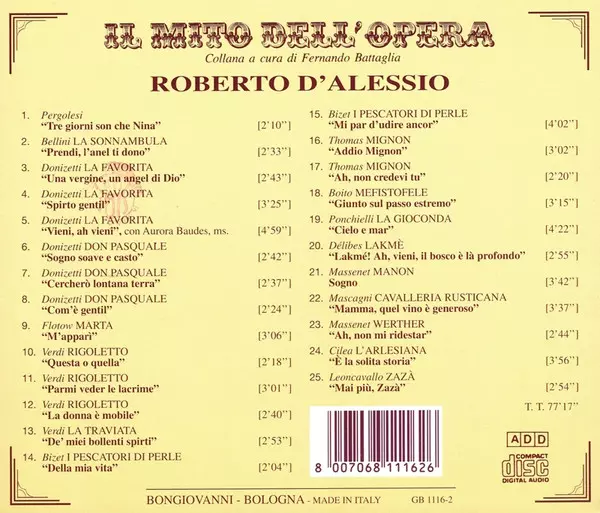 Roberto D'Alessio: Roberto D'Alessio Die Version auf CD in Standard- Auflage. Diese besondere Auflage wurde veröffentlicht in Italien im Verlag Bongiovanni am 10. Februar 1997. Album Genres übergreifend Klassische Musik und Oper.
