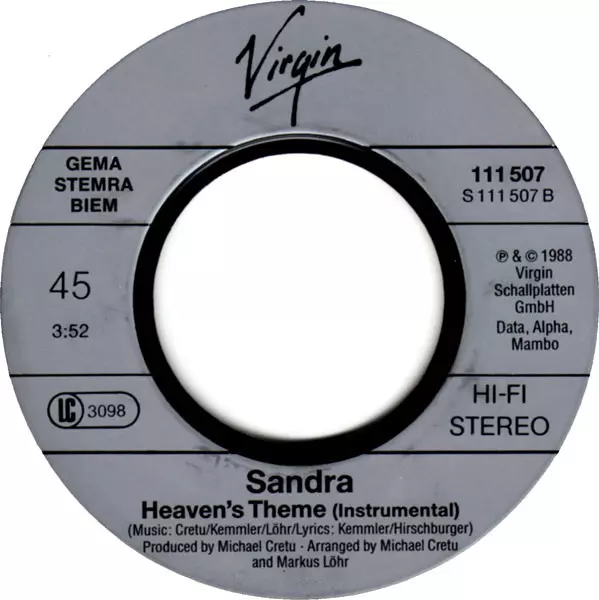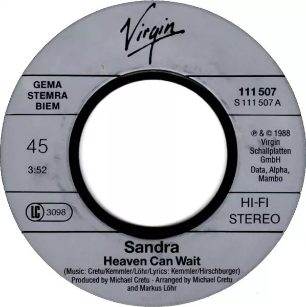 Sandra: Heaven Can Wait Die Version auf Vinyl SP in 45 RPM Auflage. Diese besondere Auflage wurde veröffentlicht in Europa im Verlag Virgin Im Jahr 1988. Album Genres übergreifend Pop, Elektronische Musik, Synth-Pop und Euro-Disco.