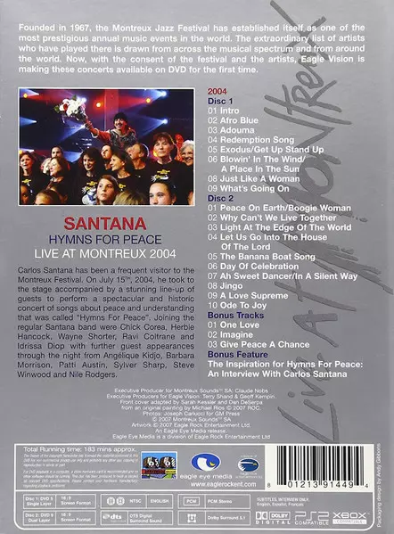 Santana: Hymns For Peace Live At Montreux 2004 DIGI Die Version auf 2DVD in digipack Auflage. Diese besondere Auflage wurde veröffentlicht in USA im Verlag Eagle Eye Media am 1. Mai 2007. Album Genres übergreifend Rock, Pop, Jazz, Lateinamerikanische Musik, Jazz-Rock und Concert Film.