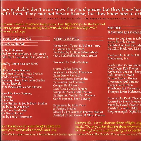 | Bass Benny Rietveld | Congas Raul Rekow | Drums Rodney Holmes | Keyboards Chester Thompson (2) | Lead Guitar Carlos Santana | Mixed By [Assistant] Andy Haller | Music By Itaal Shur | Music By, Lyrics By, Lead Vocals [Featuring] Rob Thomas | Percussion Karl Perazzo | Producer Matt Serletic | Programmed By, Edited By [Digital Editing] Mark Dobson (2) | Recorded By [Assistant] Steve Fontano | Recorded By, Mixed By David Thoener | Trombone Jeff Cressman, Jose Abel Figueroa | Trumpet Bill Ortiz, Julius Melendez | |||