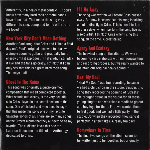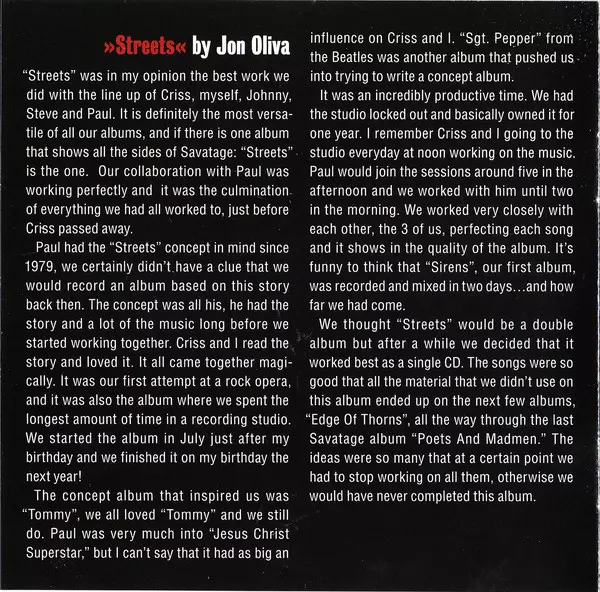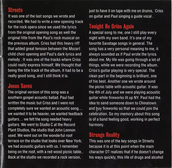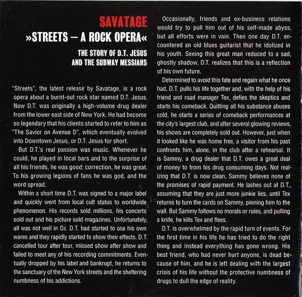 The Street: a Rock Opera is the sixth studio album by Savatage and is a rock opera about the rise and fall of fictional musician DT Jesus, a drug dealer turned rock star and addict himself. The years around 1990 were certainly the most important for the band, the years when Savatage began to break away from the relatively conventional and dry me...