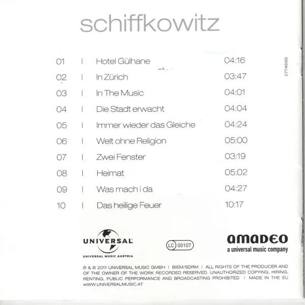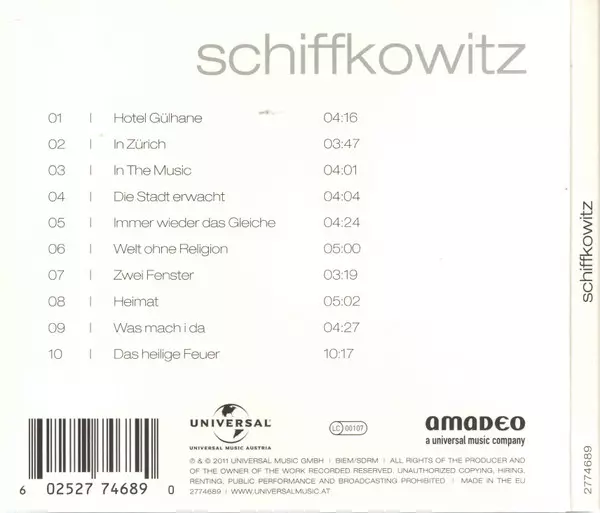 Schiffkowitz: Schiffkowitz Die Version auf CD in Standard- Auflage. Diese besondere Auflage wurde veröffentlicht in Deutschland, Österreich und Schweiz im Verlag Amadeo am 15. Juli 2011. Album kann als folgendes Genre klassifiziert werden Rock.