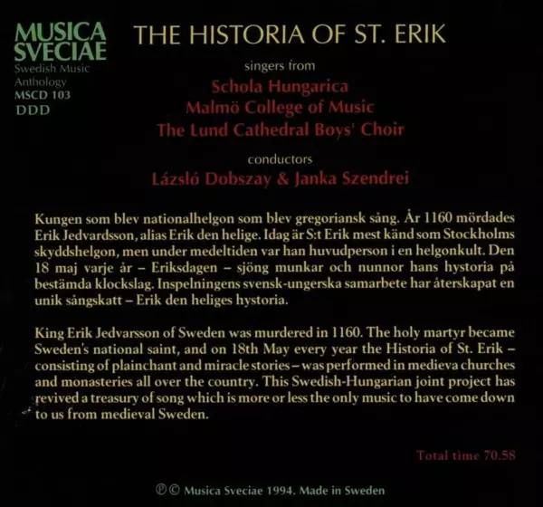 Schola Hungarica: Erik Den Heliges Hystoria Die Version auf CD/Box Set in Standard- Auflage. Diese besondere Auflage wurde veröffentlicht in Schweden im Verlag Musica Sveciae Im Jahr 1994. Album Genres übergreifend Klassische Musik, Medieval und Early. Slipcase.