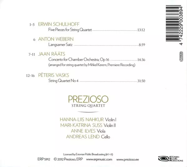 | Künstler | Erwin Schulhoff | Anton Webern | Pēteris Vasks | Jaan Rääts | String Quartet Prezioso |