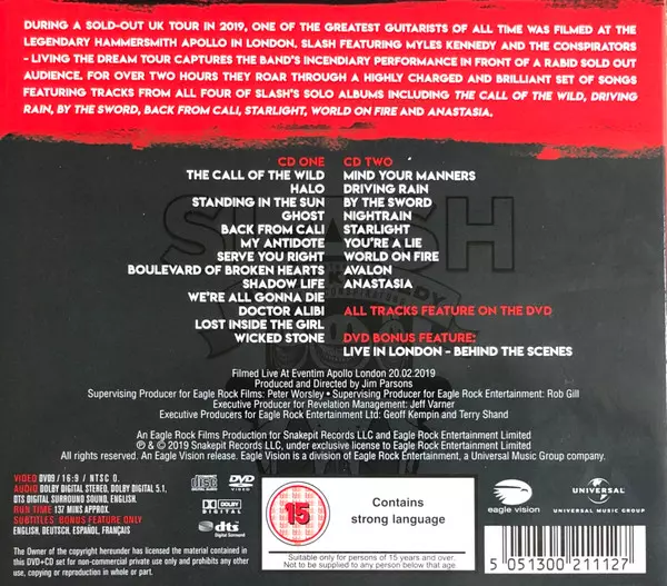 DVD+2CD Edition. Slash Featuring Myles Kennedy and the Conspirators - Living the Dream Tour captures the band's incendiary performance on their sold-out 2019 tour, in front of a rabid crowd at London's legendary Hammersmith Apollo, roaring through a highly charged 2-hour set of tracks from all four Slash solo albums. Slash tears up Hammersmith Apollo with staggering solos while dropping giant slabs of riffs with casual ease, delivering the essence of rock 'n' roll in this show. BONUS FEATURE: Live in London - Behind the Scenes