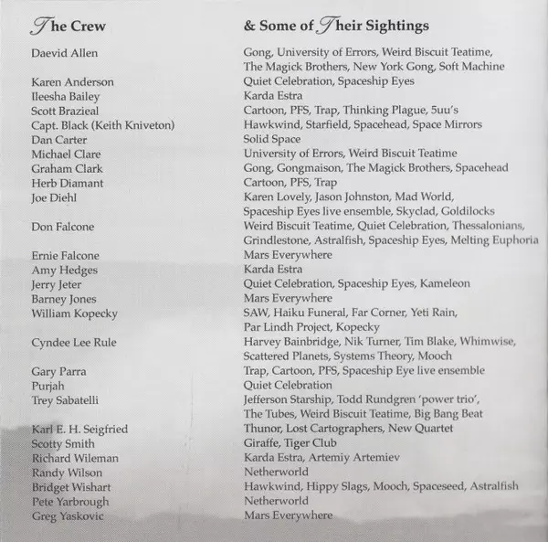 Acoustic Guitar Purjah | Bassoon Herbert Diamant | Double Bass Karl E. H. Seigfried | Drums [Part 1 & 2] Gary Parra | Drums [Part 2] Trey Sabatelli | Electric Guitar Daevid Allen | Organ Scott Brazieal | Piano, Turntables Don Falcone | Synth [Space Synth Pads] Captain Black (9) | Written-By Daevid Allen, Don Falcone, Gary Parra, Herbert Diamant, John Purves, Karl E. H. Seigfried, Keith Kniveton, Scott Brazieal, Trey Sabatelli