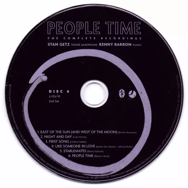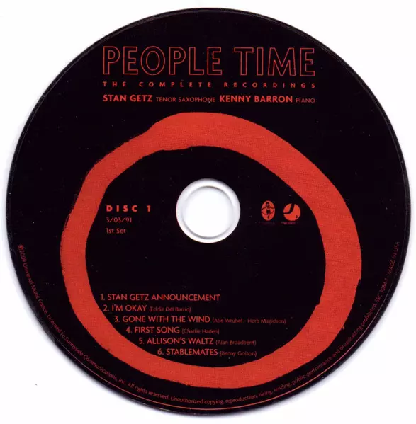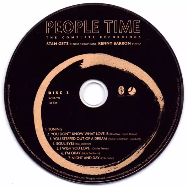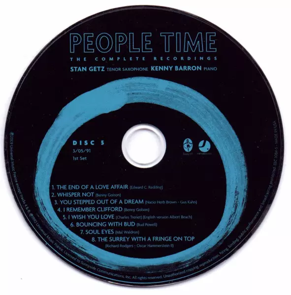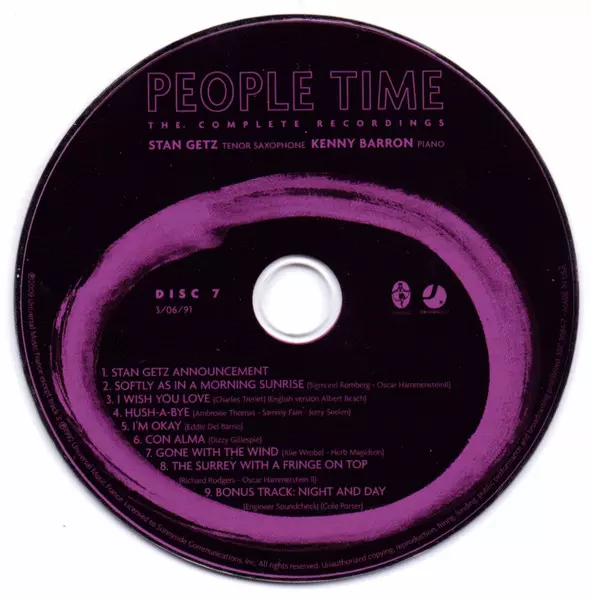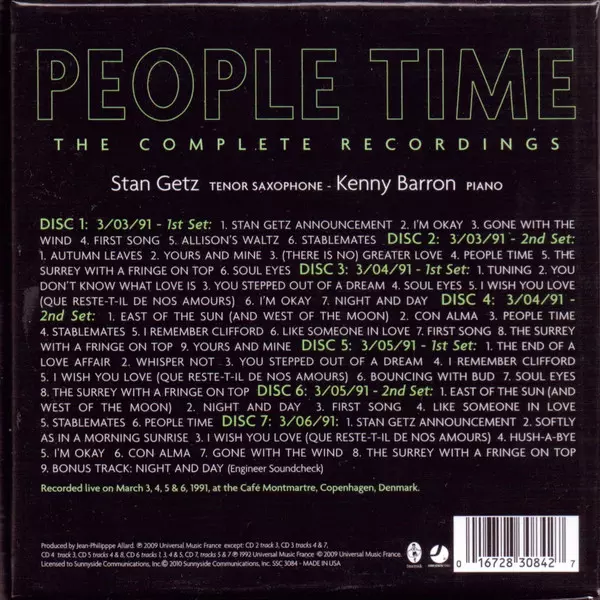 Stan Getz: People Time (The Complete Recordings) Die Version auf 7CD/Box Set in Standard- Auflage. Diese besondere Auflage wurde veröffentlicht in USA im Verlag Sunnyside In Zusammenarbeit mit Sunnyside Communications am 20. April 2010. Album Genres übergreifend Jazz, Ballade, CoolJazz und Bop.