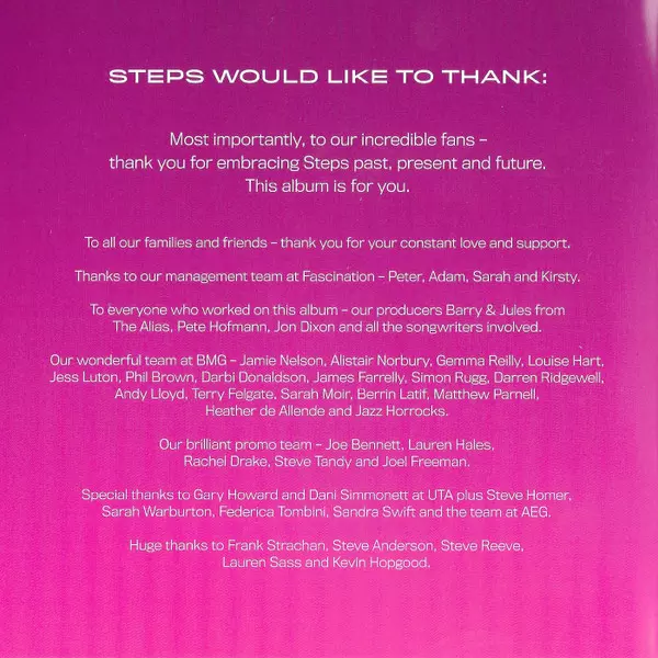 Steps ist eine britische Popgruppe, die im Mai 1997 gegründet wurde und aus den Mitgliedern Claire Richards, Faye Tozer, Lisa Scott-Lee, Lee Latchford-Evans und Ian "H" Watkins besteht. Sie sind bekannt für ihre tanzbare Musik mit einer Mischung aus Pop und gelegentlichen Balladen....