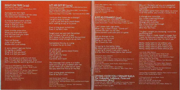 Bass Guitar, Drone [Swamp Raga], Field Recording [Swamp Raga] Tim Lefebvre | Drone [Swamp Raga], Field Recording [Swamp Raga] Bobby Tis, Tim Lefebvre | Drums, Percussion J.J. Johnson (8), Tyler Greenwell | Flute [Swamp Raga], Harmonium [Melody: Swamp Raga] Kofi Burbridge | Grand Piano, Clavinet [Hohner], Organ [Hammond], Synthesizer [Mini Moog], Electric Piano [Wurlitzer] Kofi Burbridge | Harmonium [Drone: Swamp Raga], 12-String Acoustic Guitar [Swamp Raga] Derek Trucks | Lead Guitar, Rhythm Guitar, Electric Guitar [Leslie Guitar], Acoustic Guitar Derek Trucks | Lead Vocals, Vocals Mike Mattison | Rhythm Guitar, Vocals Susan Tedeschi | Saxophone, Baritone Saxophone Kebbi Williams | Trombone, Bass Trombone Saunders Sermons | Trumpet Maurice Brown (3) | Violin, Viola Jonathan Dinklage | Vocals Doyle Bramhall II, Mark Rivers | Written By [Crying Over You] Derek Trucks, Mike Mattison, Susan Tedeschi | Written-By [Swamp Raga] Derek Trucks