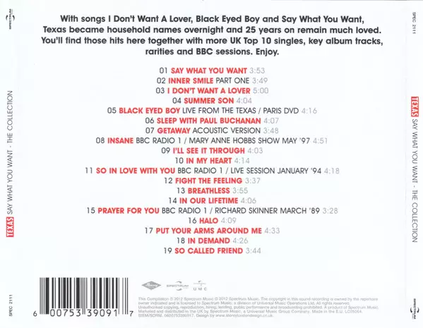 Texas: Say What You Want - The Collection Die Version auf CD in Standard- Auflage. Diese besondere Auflage wurde veröffentlicht in UK im Verlag Spectrum Music (2) am 16. Januar 2026. Album Genres übergreifend Rock, Pop und Pop Rock.