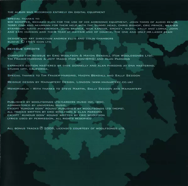 Bass David Paton | Drums, Percussion Stuart Elliott | Effects [Traffic FX] Tony Richards | Guitar Ian Bairnson | Sequencer [Synth Sequences] Alan Parsons | Synthesizer, Saxophone Richard Cottle