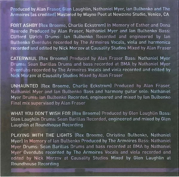 Bass Clifford Ulrich | Drums, Producer, Engineer, Recorded By Ian Bulbenko | Producer Nathaniel Myer | Producer, Mixed By Alan Fraser (2) | Recorded By [Overdubs] The Armoires | Recorded By [Vocals, Viola and Harmonica], Edited By [Vocals, Viola and Harmonica] Nick Morzov (2) | Written-By Charlie Eckstrom, Rex Broome