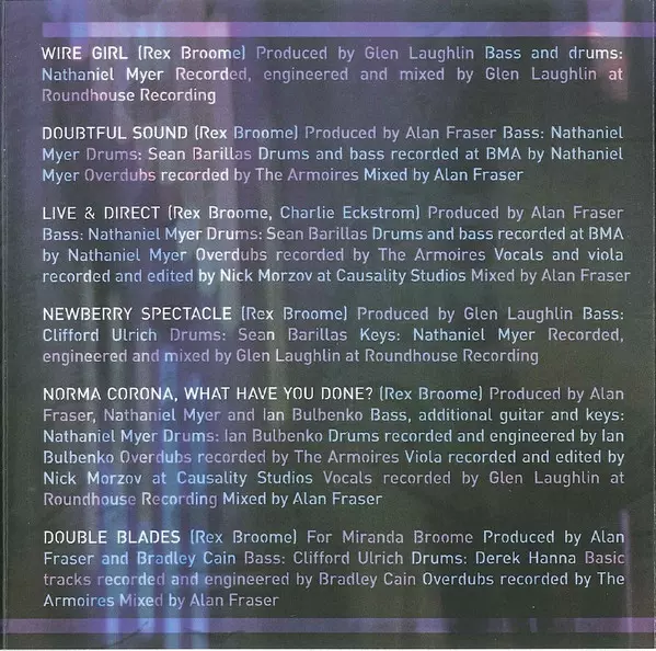 Bass, Recorded By [Drums and Bass] Nathaniel Myer | Drums Sean Barillas | Producer Alan Fraser (2) | Recorded By [Overdubs] The Armoires | Recorded By [Vocals, Viola and Harmonica], Edited By [Vocals, Viola and Harmonica] Nick Morzov (2) | Written-By Rex Broome