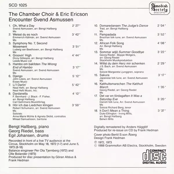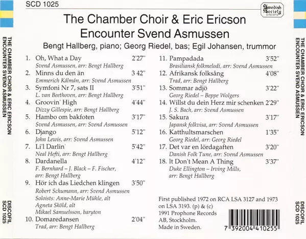 Eric Ericson: The Chamber Choir & Eric Ericson Encounter Svend Asmussen Die Version auf CD in Standard- Auflage. Diese besondere Auflage wurde veröffentlicht in Schweden im Verlag Swedish Society Discofil am 13. April 1991. Album Genres übergreifend Klassische Musik, Jazz und Choral.
