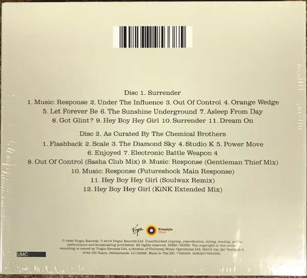 The Chemical Brothers: Surrender Die Version auf 2CD in Standard- Auflage. Diese besondere Auflage wurde veröffentlicht in Europa im Verlag UMC In Zusammenarbeit mit Virgin und Freestyle Dust am 9. August 2022.