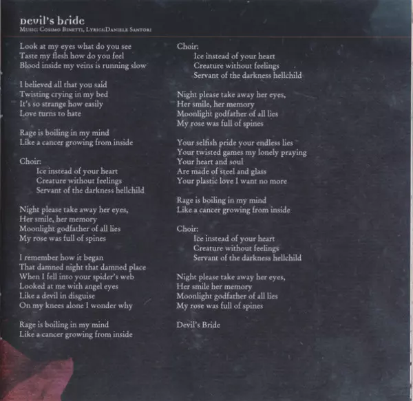 Symphonic Gothic/Power Metal band from Italy formed in 1999. Current line-up Daniele Santori: Vocals Cosimo Binetti: Guitar Stefano Smeriglio: Keyboards, Piano Marco Bianchella: Drums Giacomo Astorri: Bass Former/past member Giuseppe Chirico: Drums Steve Vawamas: Bass Masso: Bass