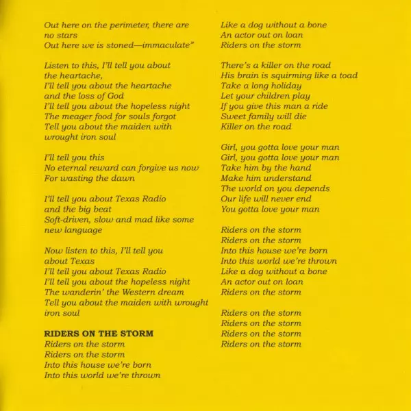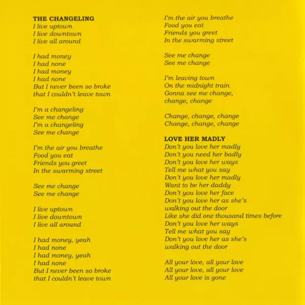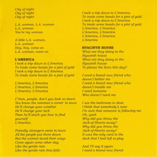 A few months before Jim Morrison's death in Paris, L.A. Woman, the most blues-influenced album, was released. The most successful single was Love Her Madly, written by guitarist Robbie Krieger, whose girlfriend regularly threatened to leave him. According to Rolling Stone magazine, the song is composed of Chuck Berry's best riffs since the Stone...