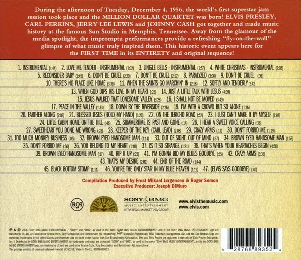 The Million Dollar Quartet: The Complete Million Dollar Quartet Die Version auf CD in remastered Auflage. Diese besondere Auflage wurde veröffentlicht in Europa und UK im Verlag RCA In Zusammenarbeit mit Sun Record Company und Sony BMG Music Entertainment Strategic Marketing Group am 22. September 2006. Album Genres übergreifend Rock, Folk, World, & Country, Country, Rock & Roll, Bluegrass und Gospel.