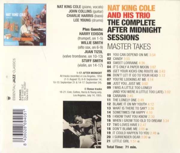 The Essential Jazz Classics label presents the complete 1956 recording of Nat King Cole's 'After Midnight' Sessions - with 4 bonus tracks. Released at a time when he was more of a singer and entertainer than a jazz pianist to the general public, this album is a reminder of Nat's outstanding instrumental abilities. Throughout the rest of his succ...