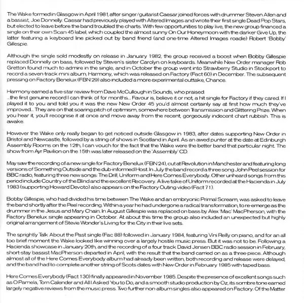 The Wake is a post-punk and later indie pop band that formed in Glasgow, Scotland, in 1981. The group was initially part of the early 1980s UK post-punk scene, and they were associated with the influential independent label Factory Records. The Wake's sound evolved over time from t...