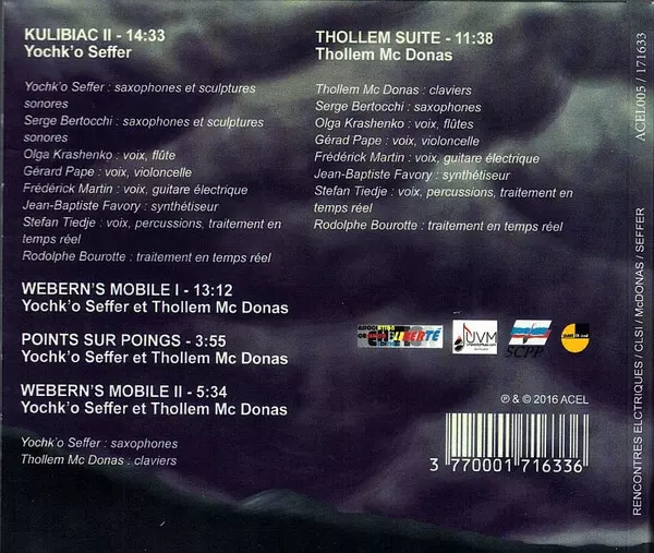 | Composed By Yochk'o Seffer | Electronics [Traitement En Temps Réel] Rodolphe Bourotte | Saxophone, Performer [Sculptures Sonores] Serge Bertocchi, Yochk'o Seffer | Synthesizer Jean-Baptiste Favory | Voice, Cello Gérard Pape | Voice, Electric Guitar Frédérick Martin | Voice, Flute Olga Krashenko | Voice, Percussion, Electronics [Traitement En Temps Réel] Stefan Tiedje | |||